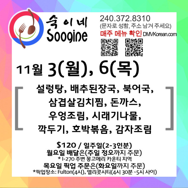 [숙이네 반찬] 11월 3일(월) / 6일(목) 메뉴 입니다