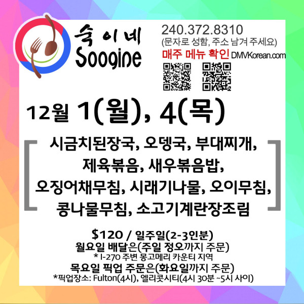 [숙이네 반찬] 12월 1일(월) / 4일(목) 메뉴 입니다