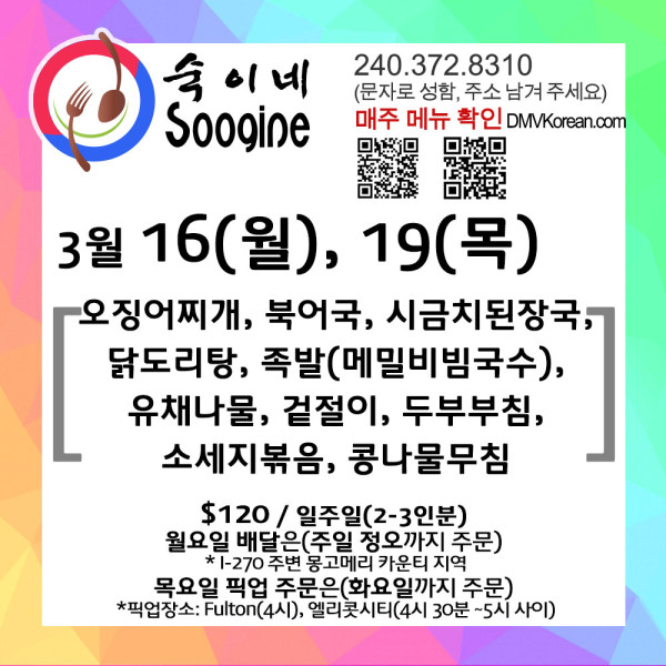 [숙이네 반찬] 3월 16일(월) / 19일(목) 메뉴입니다