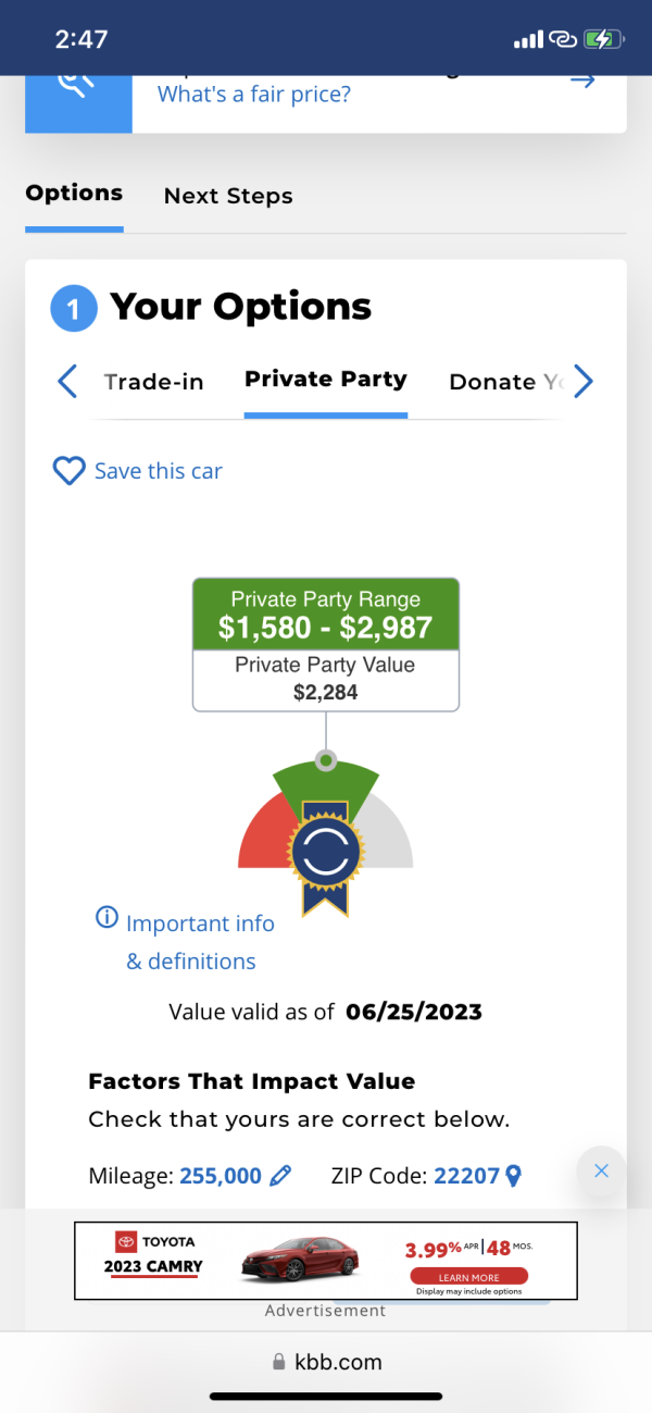 주행거리는 영입 당시 234,000 마일 정도, 현재 255,000 miles 돌파했고 해당 마일리지로 condition good 기준 kbb 시세 2400불 정도 하네요. 그 근처에서 팔아볼까 싶구요. 계속 타는 차라 마일리지는 조금씩 올라갈 예정입니다.