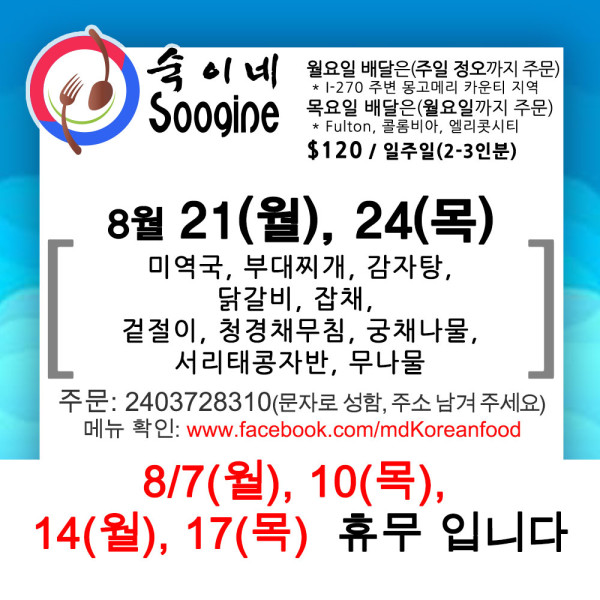 MD [숙이네 반찬] 8월 21일(월) / 24일(목) 메뉴 입니다