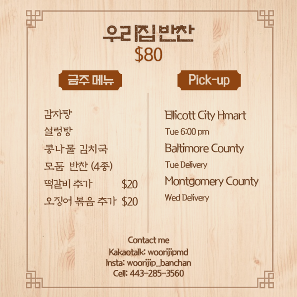 MD [우리집 반찬] 6월 27, 28 일차 메뉴 페이지 정보 작성자 씬나 댓글 0건 조회 3,771회 작성일 23-06-22 23:50 본문 배달 문의는 카톡 woorijipmd, 443-285-3560 으로 부탁 드립니다. 감사합니다 목록 이전글[숙이네 반찬] 6월 26일(월) / 29일(목) 메뉴 입니다 23.06.23 다음글[숙이네 반찬] 6월 19일(월) / 22일(목) 메뉴 입니다 23.06.16 댓글목록 댓글목록 등록된 댓글이 없습니다.