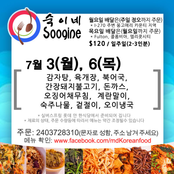 MD [숙이네 반찬] 7월 3일(월) / 6일(목) 메뉴 입니다