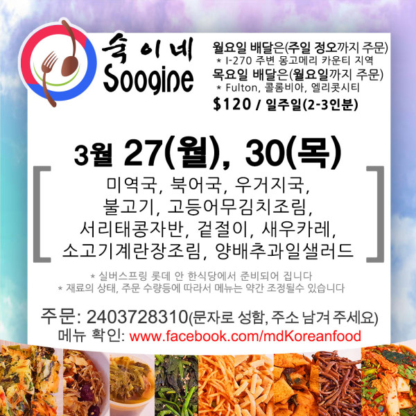 MD [숙이네 반찬] 3월 27일(월) / 30일(목) 메뉴 입니다
