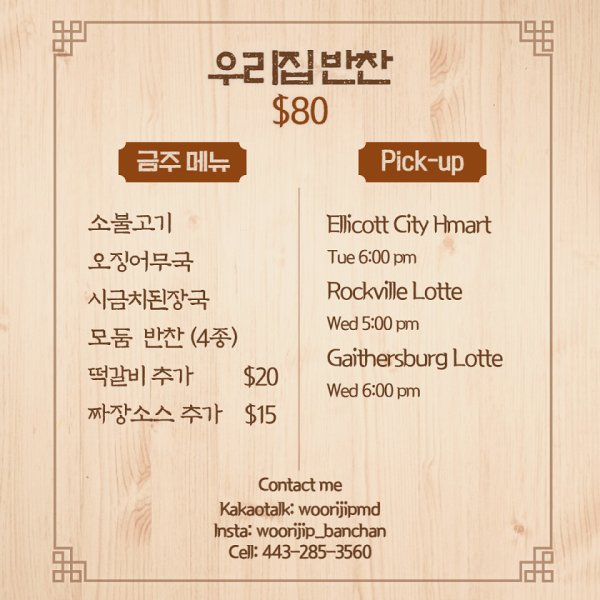우리집 반찬 3월 27일 주차 메뉴입니다. 문의는 카톡 woorijipmd, 443-285-3560 으로 부탁드립니다. 감사합니다