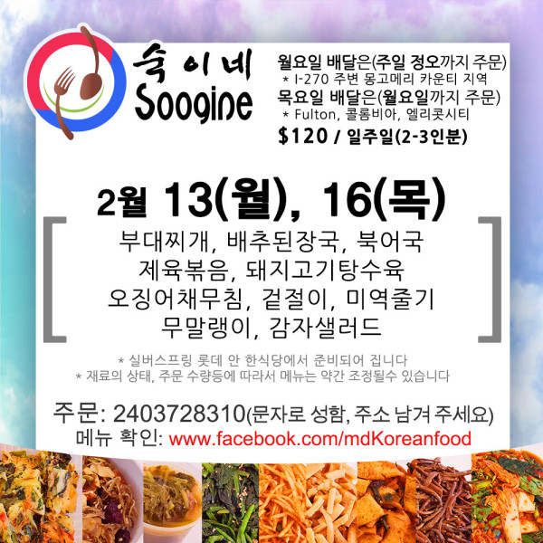MD [숙이네 반찬] 2월 13(월), 16(목) 메뉴입니다