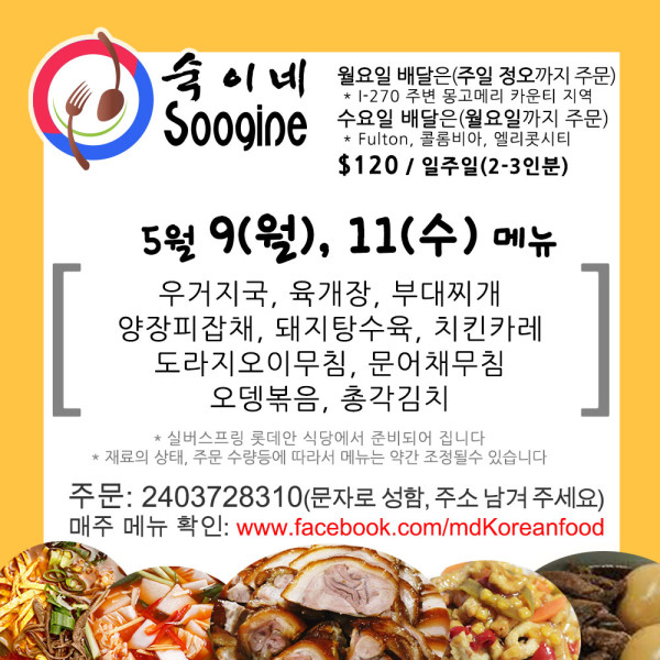MD [숙이네 반찬] 5월 9(월), 11일(수) 배달음식 메뉴입니다