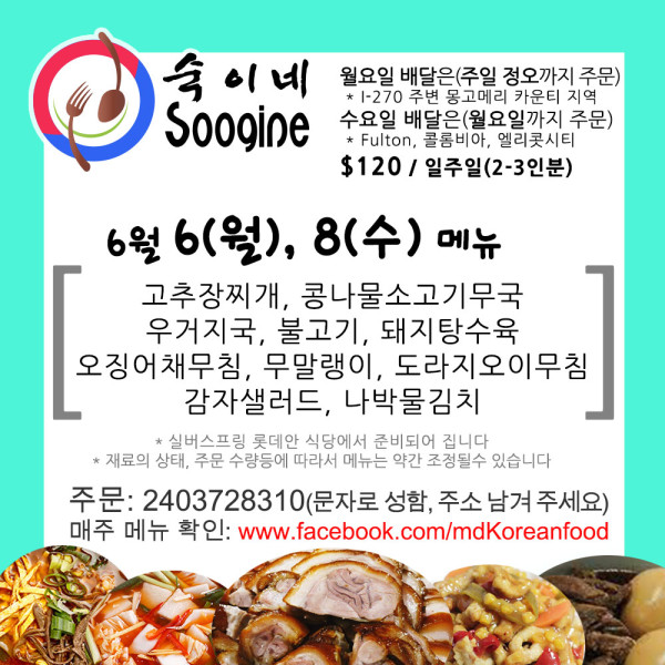 MD [숙이네 반찬] 6월 6(월), 8일(수) 배달음식 메뉴입니다
