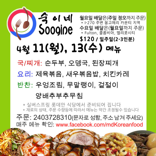 MD [숙이네 반찬] 4월 11(월), 13일(수) 배달음식 메뉴입니다