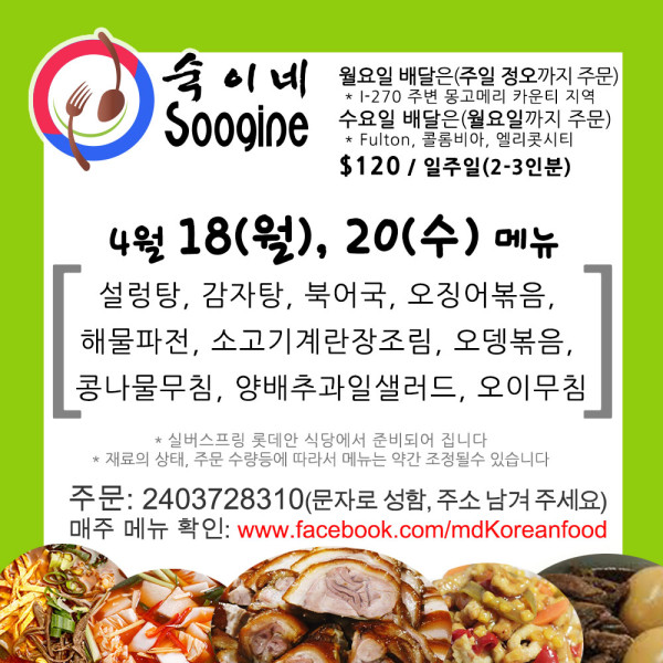 MD [숙이네 반찬] 4월 18(월), 20일(수) 배달음식 메뉴입니다