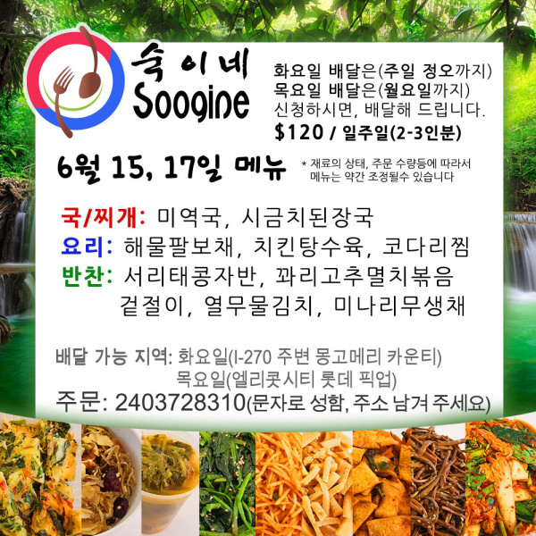 MD [숙이네 반찬] 6월 15, 17일 배달음식 메뉴입니다