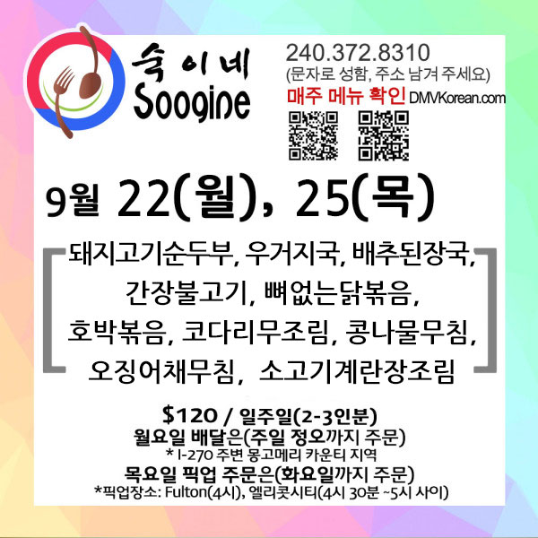 [숙이네 반찬] 9월 22일(월) / 25일(목) 메뉴 입니다