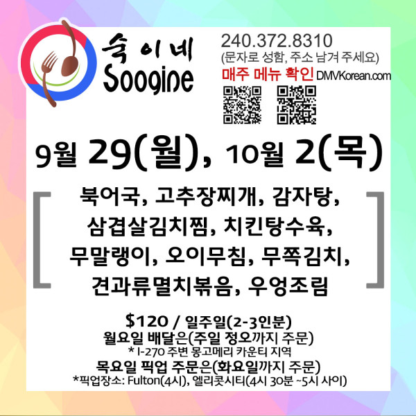 [숙이네 반찬] 9월 29일(월) / 10월 2일(목) 메뉴 입니다