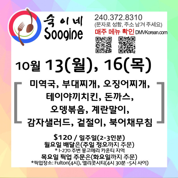 [숙이네 반찬] 10월 13일(월) / 16일(목) 메뉴 입니다