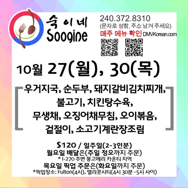 [숙이네 반찬] 10월 27일(월) / 30일(목) 메뉴 입니다