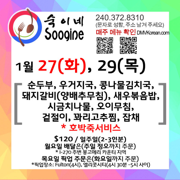 [숙이네 반찬] 1월 27일(화) / 29일(목) 메뉴입니다
